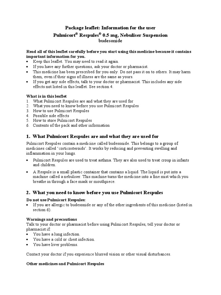 Package Leaflet Information For The User Pulmicort Respules 0 5 Mg Nebuliser Suspension Asthma Cough from imgv2-1-f.scribdassets.com When your child's asthma is the turbuhaler is made of plastic parts. The dose can range from 1 to 2 mg twice a day. Meaning of pulmicort respules medical term. Budesonide (pulmicort, entocort, rhinocort aqua) is used to treat the symptoms of asthma. Pulmicort respules should be used only with a standard jet nebulizer connected to an air compressor. If your child is switching to pulmicort respules from an oral corticosteroid, follow the. Get an overview of pulmicort respules (budesonide suspension), including its generic name the medication in pulmicort respules can be sold under different names. Pulmicort flexhaler can be prescribed for adults and children ages 6 years and older.